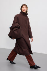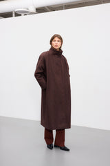 Long loose fitted coat. Designed with a wrap silhouette and a high collar. The coat features two sideaseam pockets and a double breasted front closing with descreet metal pressbuttons.