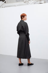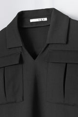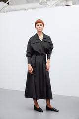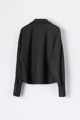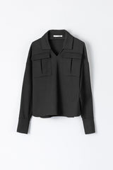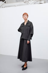 Versatile overshirt in fine Bistretch Merino wool. Rounded wide hem at bottom to be worn outside skirt and trouser aswell as inside.