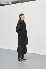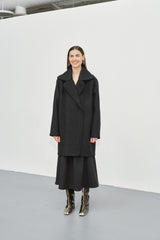 Discover our knee-length Rearrange coat, crafted from luxurious 100% Norwegian lambswool tweed. The coat features a slightly oversized fit and bold lapels, giving you a comfortable and contemporary style. The Rearrange coat is finished with a decorative black wool trim. Discreet seam pockets provide practicality while maintaining a sleek silhouette. Ideal for mid seasons and perfect for layering in winter.